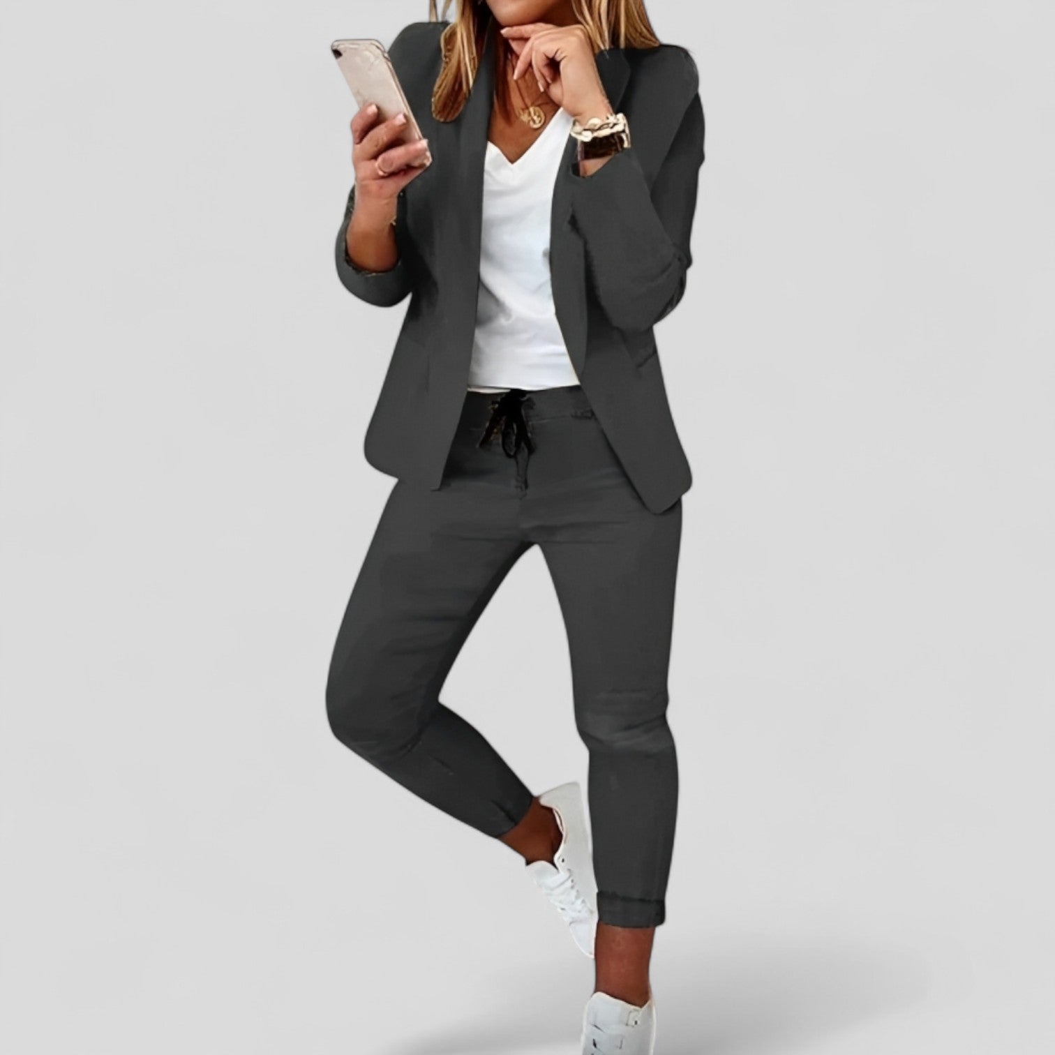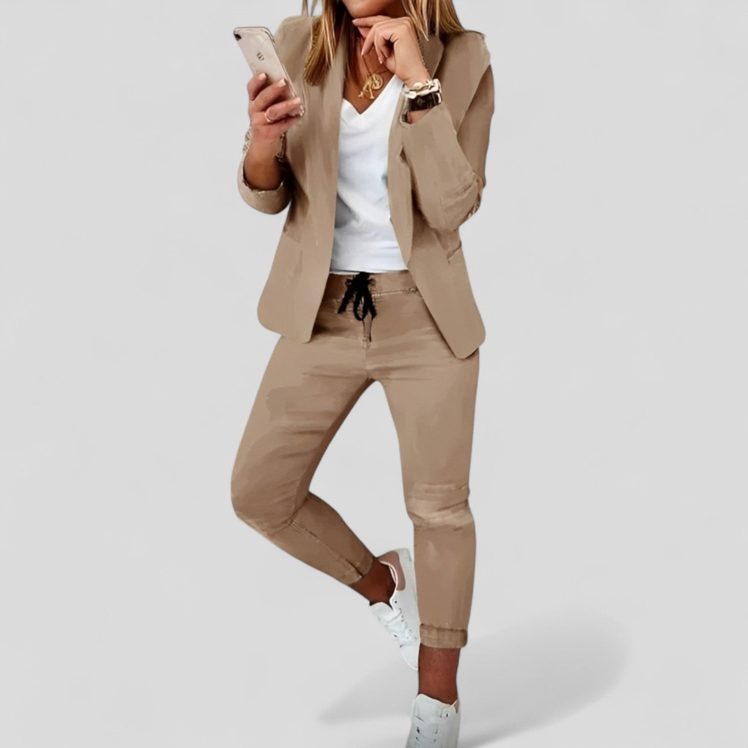 Conjunto Moderno de Dos Piezas: Este elegante conjunto combina un pantalón ajustado con un blazer entallado, ofreciendo una perfecta fusión de informalidad deportiva y elegancia formal que asegura un estilo impecable para el día a día.