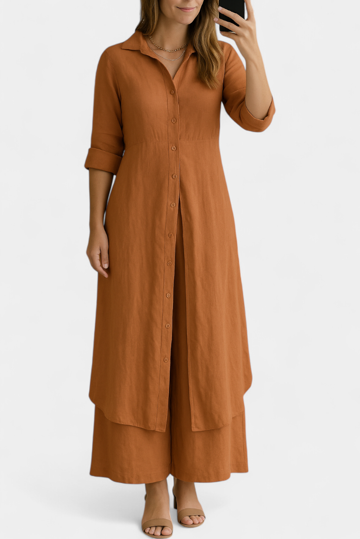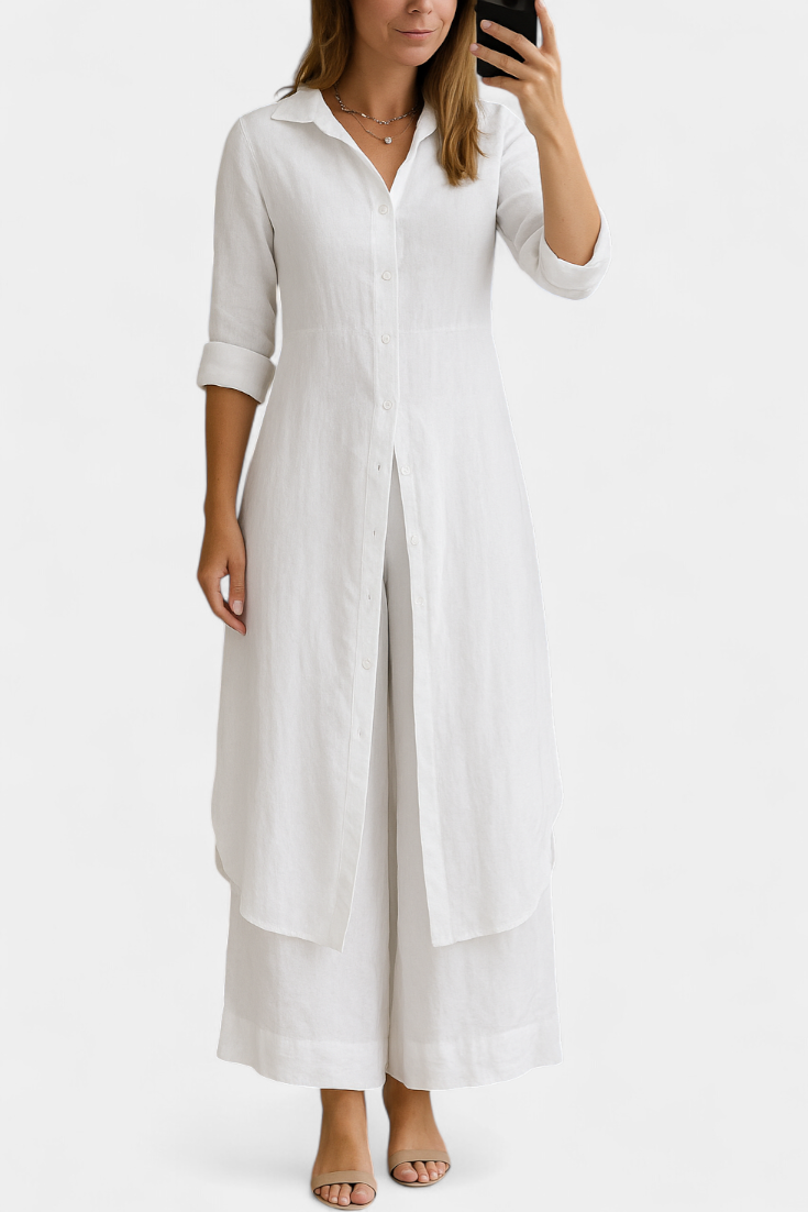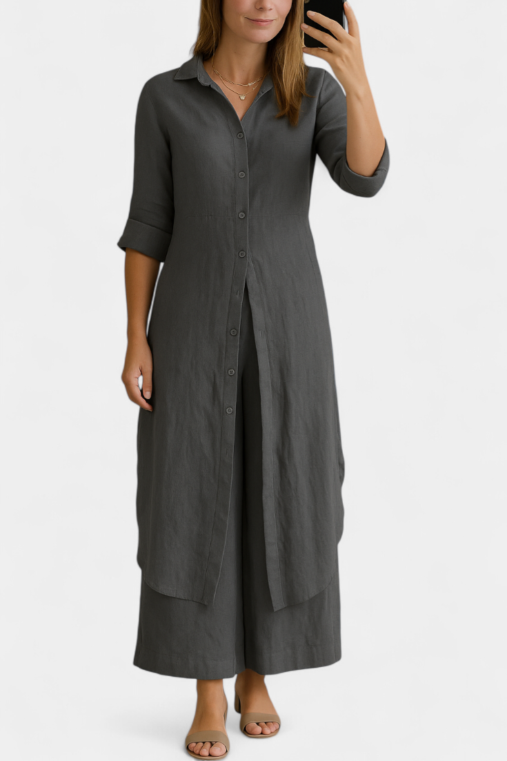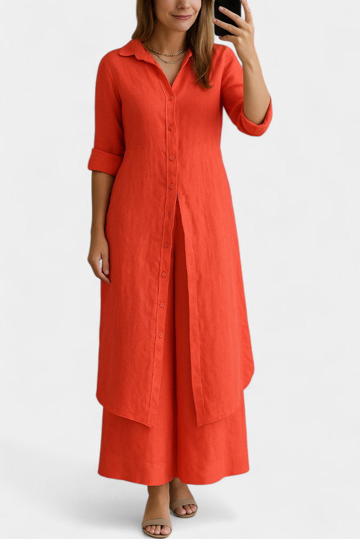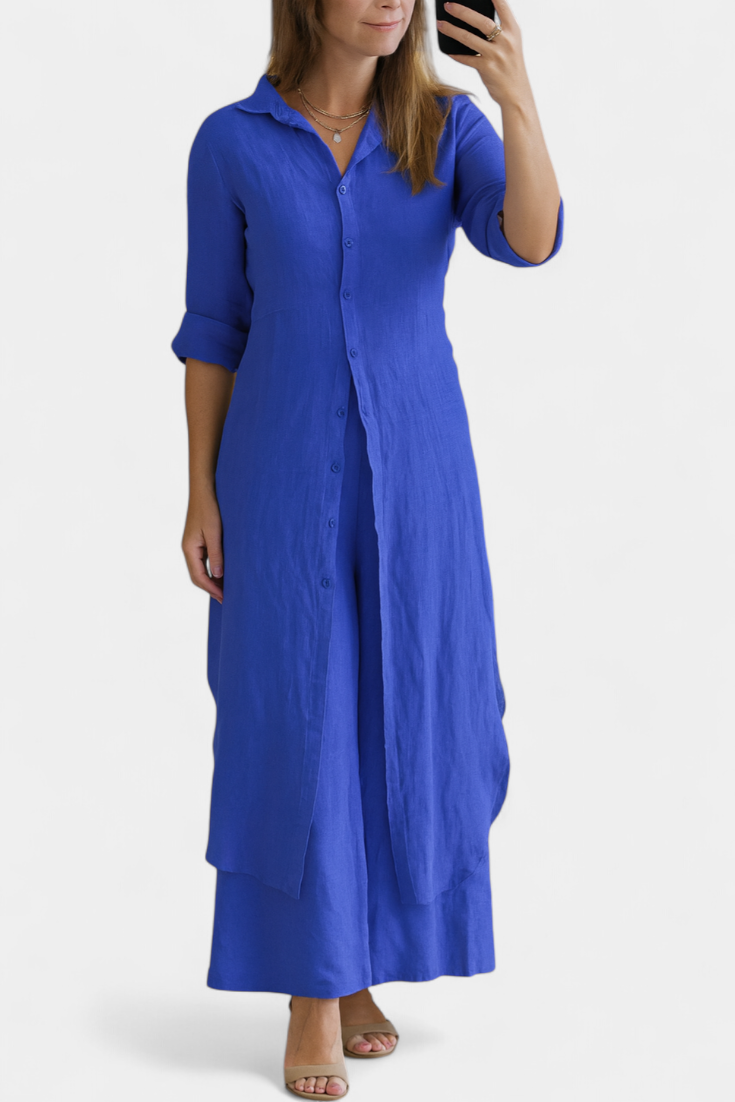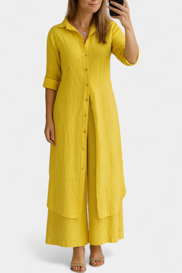 Ligero, natural y refinado: el conjunto Palmer celebra la elegancia relajada del lino puro. Formado por un vestido camisero largo con cuello clásico y un pantalón suelto de corte fluido, ofrece un look completo que combina frescura y sofisticación en cada movimiento. Confeccionado en 100% lino europeo, aporta comodidad transpirable y una presencia impecable para los días más cálidos.