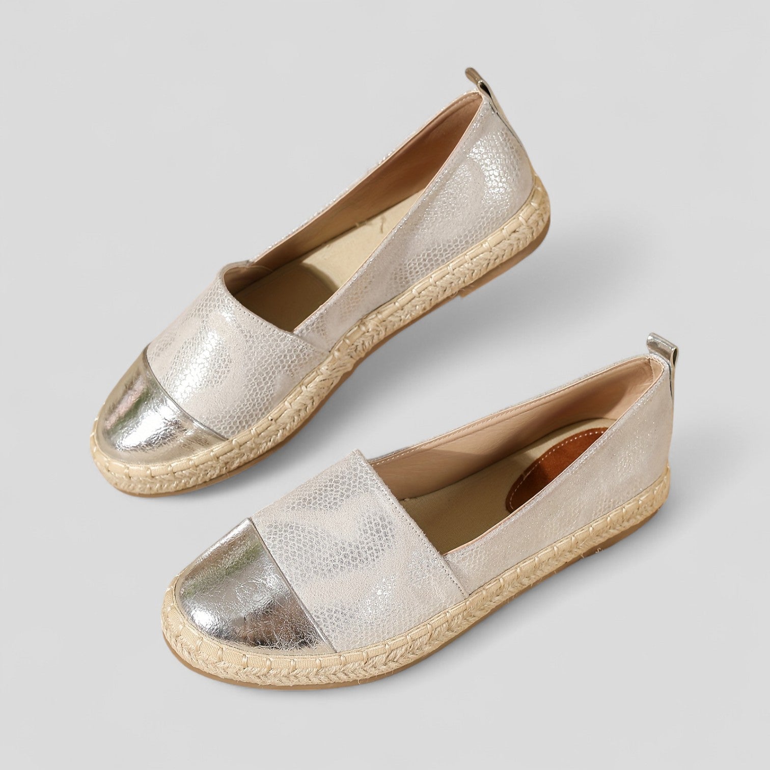 Estas alpargatas combinan un toque metálico con suela de esparto. Ideales para looks casuales con estilo.