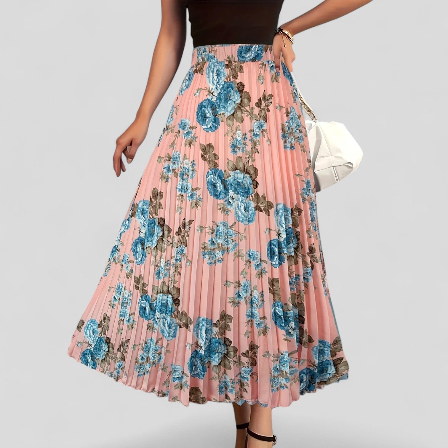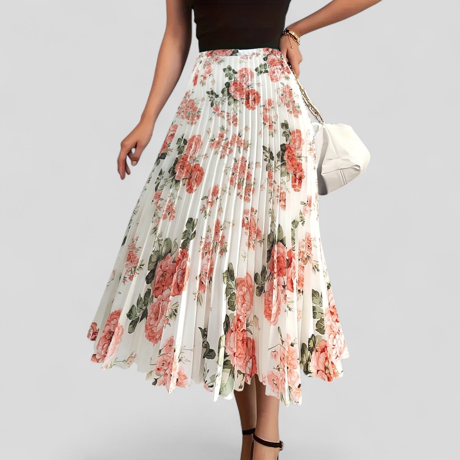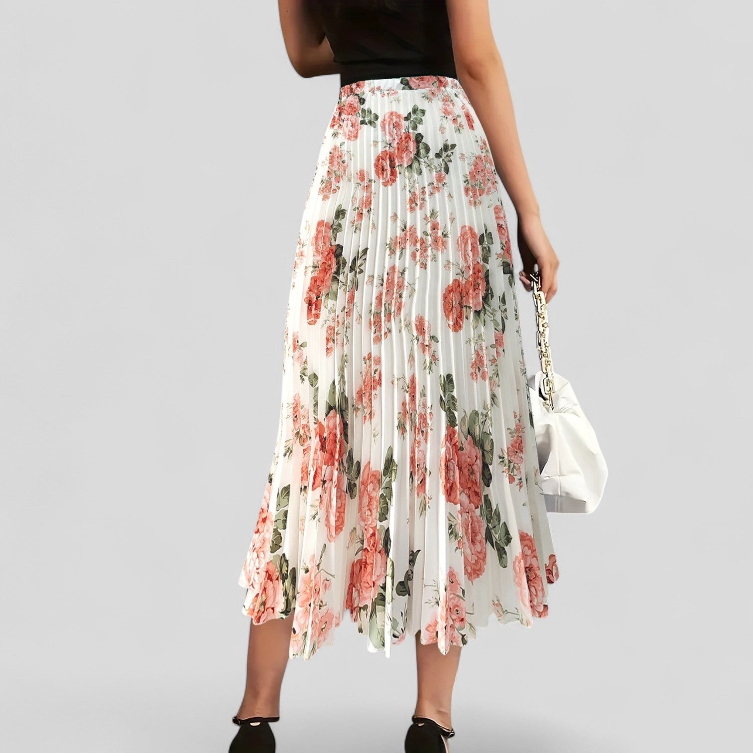 Descubre la encantadora falda midi con finos pliegues y un romántico estampado floral. Su silueta que se mueve añade un toque juguetón a cada paso, mientras que el suave forro interior y la cintura lisa aseguran una comodidad inigualable.