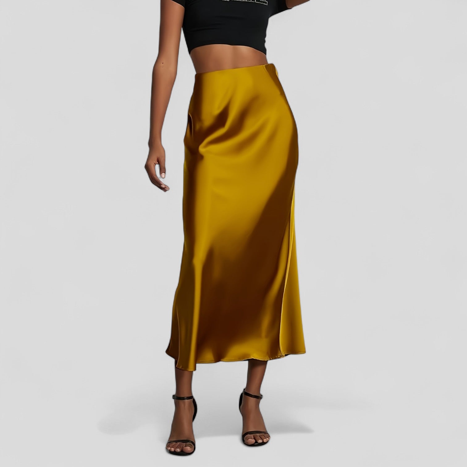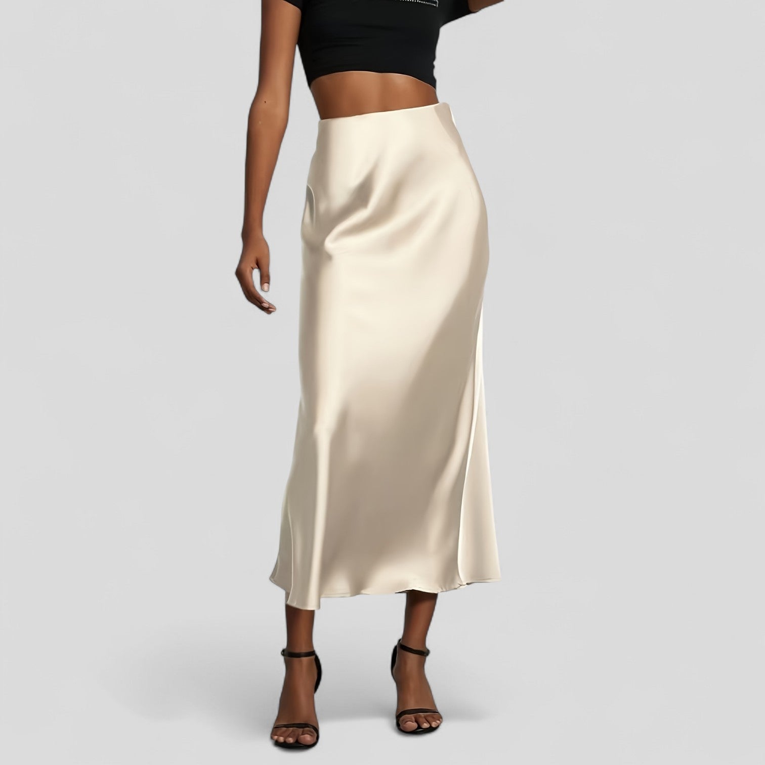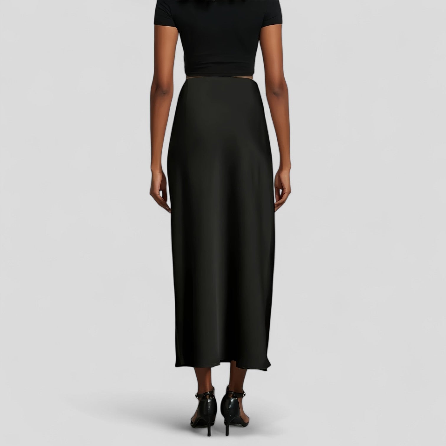 Maxifalda de dama en suave satén con una cintura alta y estrecha que alarga la silueta y proporciona un ajuste favorecedor. Su corte recto y sencillo se mueve con ligereza, ofreciendo gran comodidad al llevarla. La superficie fina y lisa otorga un caído elegante y fluido, con un brillo sutil.
