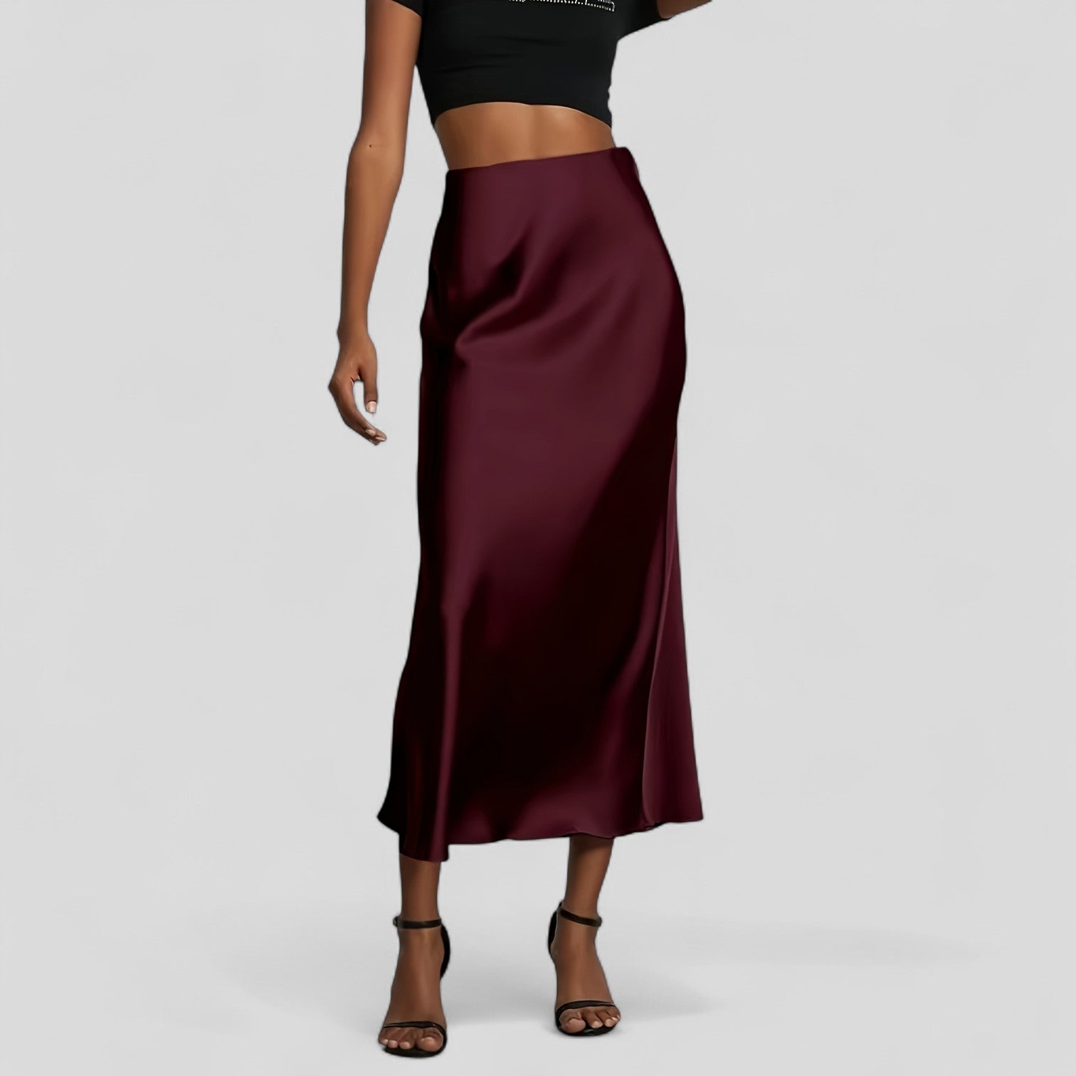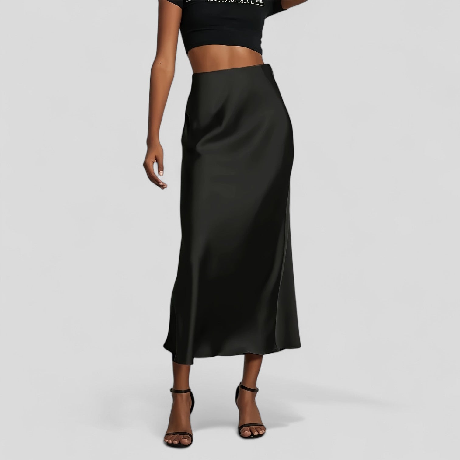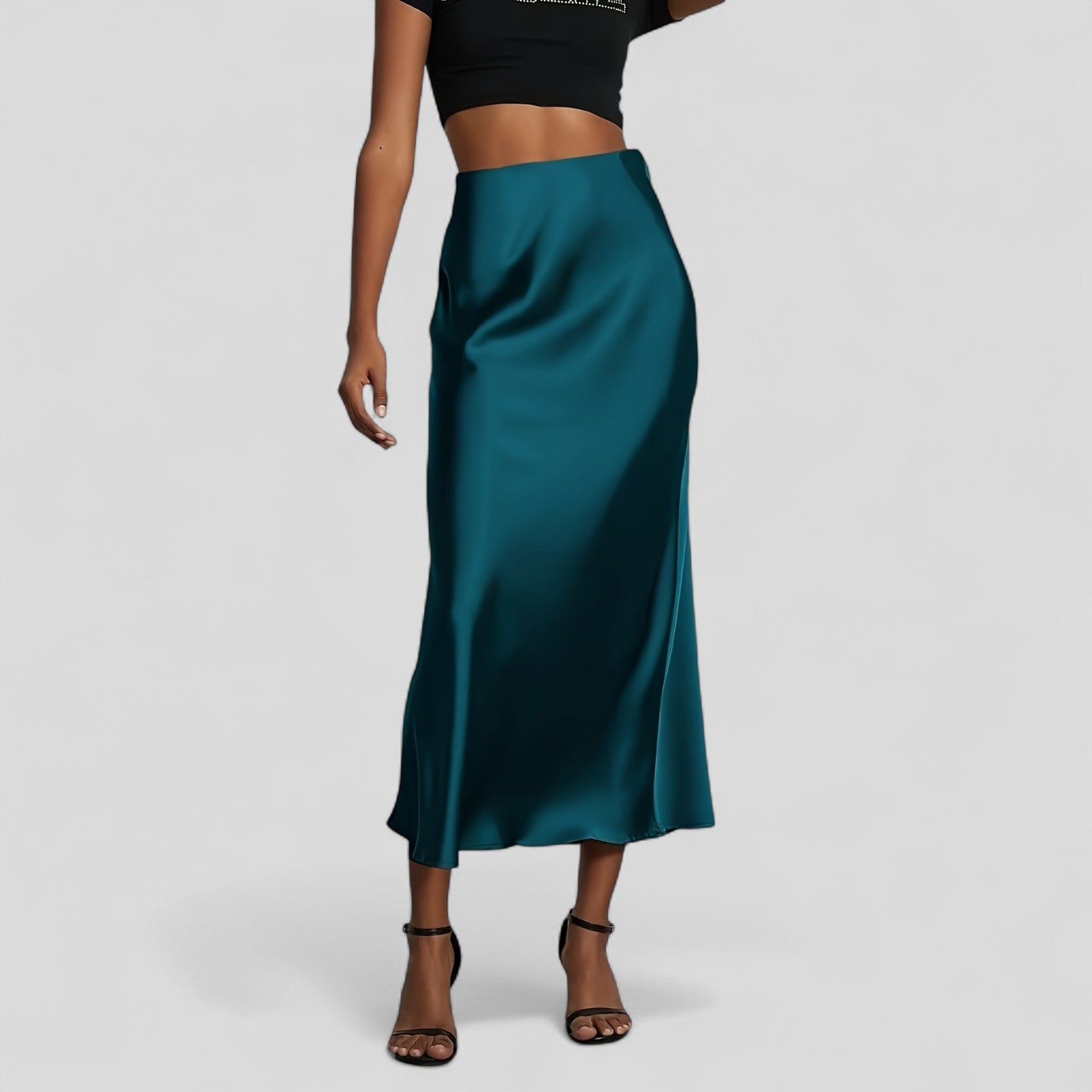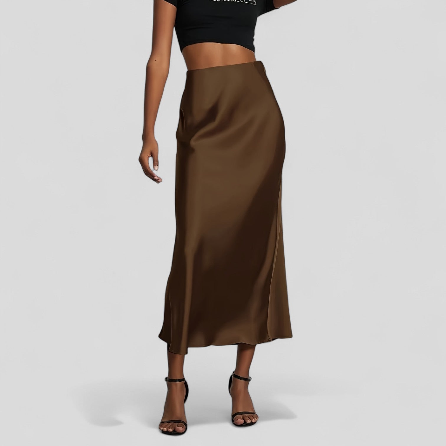 Maxifalda de dama en suave satén con una cintura alta y estrecha que alarga la silueta y proporciona un ajuste favorecedor. Su corte recto y sencillo se mueve con ligereza, ofreciendo gran comodidad al llevarla. La superficie fina y lisa otorga un caído elegante y fluido, con un brillo sutil.
