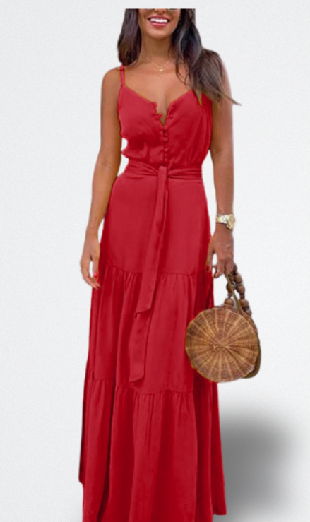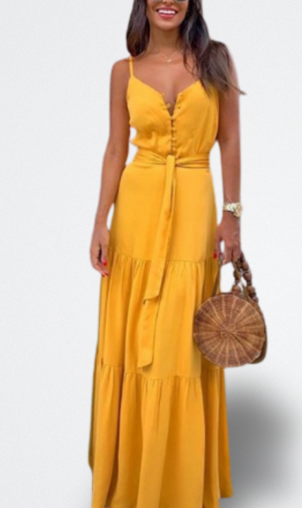 Brilla con luz propia con el Vestido Largo Sofía. Su tono amarillo radiante te envuelve como un rayo de sol: alegre, libre y simplemente inolvidable. Ideal para paseos en vacaciones, fiestas al aire libre o cenas al atardecer junto al mar, convierte cada paso en una entrada de película. Su escote en V y los volantes en cascada no solo favorecen... también conquistan. Es ese vestido que hace que todos se giren y que te hace sentir como si el verano te hubiera besado la piel.