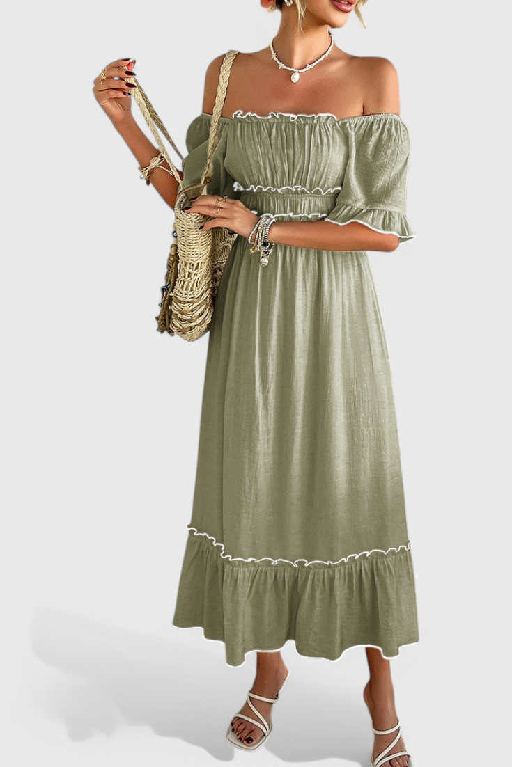Elegancia relajada con un toque femenino. El Vestido Midi Noémie presenta un escote sin hombros y un dobladillo con volantes suave que se mueve con facilidad. Confeccionado en una mezcla de algodón transpirable, esta silueta inspirada en el boho está hecha para días llenos de sol y encanto sin esfuerzo.